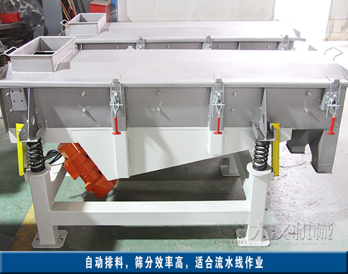 直線振動篩又被稱為直線篩,是一種運動軌跡為直線的新型、振動篩分設備。直線震動篩利用振動電機激振作為振動源,使物料在篩網上被拋起,同時向前作直線運動,物料從給料機均勻地進入篩分機的進料口,通過多層篩網產生數種規格的篩上物、篩下物、分別從各自的出口排出。具有處理量大、篩分效率高、篩網更換方便、安裝及維修簡單等優點。