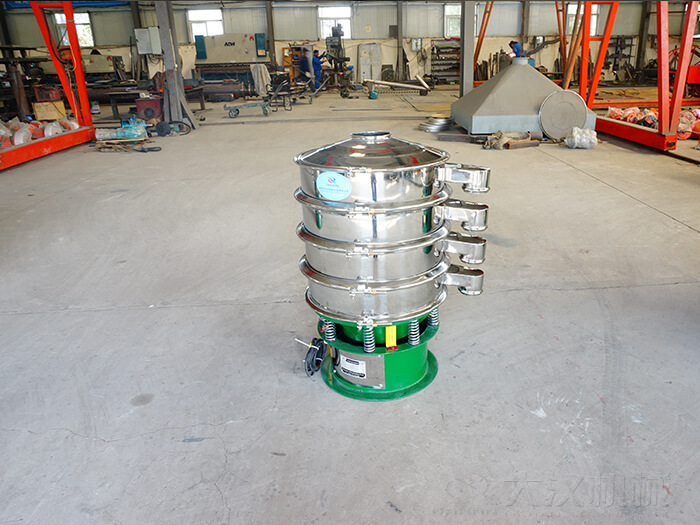 多層圓形振動(dòng)篩主要由由進(jìn)料口、防塵蓋、出料口、束環(huán)、篩網(wǎng)、配重塊、上部重錘、振動(dòng)體、振動(dòng)電機(jī)、彈簧、下部重錘、機(jī)座等部分組成。采用立式振動(dòng)電機(jī)作為激振源,通過振動(dòng)電機(jī)上下兩端的偏心重錘將旋轉(zhuǎn)運(yùn)動(dòng)轉(zhuǎn)變?yōu)樗健⒋怪薄A斜的三次元運(yùn)動(dòng),并傳遞到旋振篩的篩面上;物料通過入料口進(jìn)入設(shè)備內(nèi),根據(jù)不同物料篩分要求,物料經(jīng)過1-5層采用不同目數(shù)的金屬編織篩網(wǎng)的篩分層,在這個(gè)過程中,位于各層的篩網(wǎng)下的清網(wǎng)裝置(彈跳球)通過頻率振動(dòng)不斷撞擊篩網(wǎng),使篩網(wǎng)上層物料能夠順暢的透網(wǎng)篩分,并有效解決了物料堵網(wǎng)問題出現(xiàn),不同目數(shù)的物料通過各層對應(yīng)目數(shù)的篩網(wǎng)后在各層的出料口排出,終實(shí)現(xiàn)篩選除雜或過濾分級的目的。