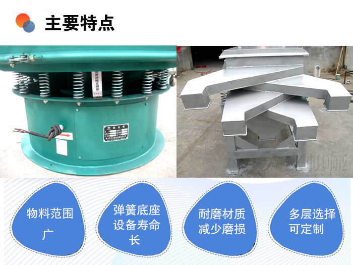 2、適用彈簧底座,可以在降低物料對篩網(wǎng)的沖擊,延長篩機(jī)使用壽命;