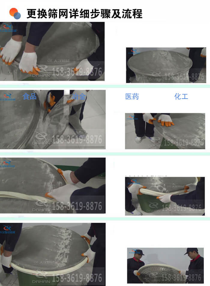 1、先把旋振篩束環(huán)螺絲松掉,卸下上框,把已破損的細(xì)網(wǎng)取下,代之以新的細(xì)網(wǎng)。