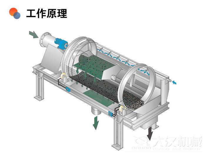 滾筒篩分機(滾筒式篩分機)主要由電機、減速機、滾筒裝置、機架、密封蓋、進料口、出料口等部分組成。,當滾筒篩工作時,電動機經(jīng)減速器與滾筒裝置通過聯(lián)軸器連接在一起,驅(qū)動滾筒裝置繞其軸線轉(zhuǎn)動。當物料進入滾筒裝置后,由于滾筒裝置的傾斜與轉(zhuǎn)動,使篩面上的物料翻轉(zhuǎn)與滾動的同時,自上而下通過分級篩網(wǎng)析出,由于篩網(wǎng)規(guī)格不同,物料直接被分離篩選。從而使合格物料(篩下物)經(jīng)滾筒外圓的篩網(wǎng)排出,不合格的物料(篩上物))經(jīng)滾筒末端排出。