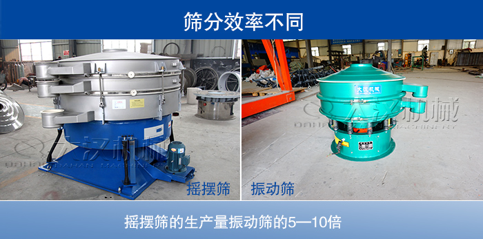 針對30目以粗上物料而言,振動篩于搖擺篩產量基本相同,對30以細至500目原材料來說,搖擺篩的生產量則大大高過振動篩,搖擺篩是振動篩的5—10倍。