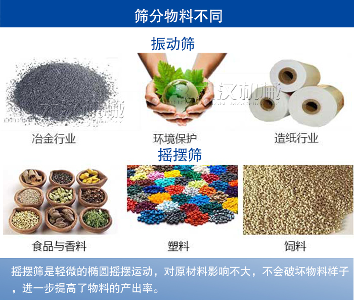 搖擺篩是模仿人工篩分的低頻旋振篩,原材料在篩表面做非線性的三維運動,而振動篩是運用不均衡重錘式使電機做平均水平,垂直,傾斜的三次元運動,進而更改原材料的運動大方向。
