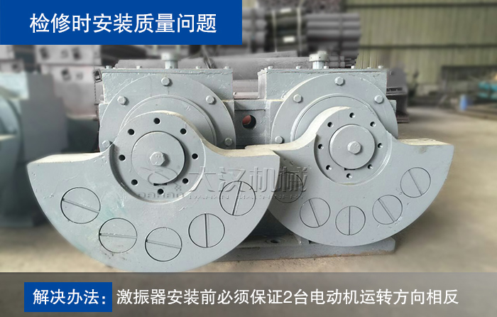 解決辦法:安裝時(shí)2臺(tái)電動(dòng)機(jī)應(yīng)盡量選擇阻尼相同,停機(jī)時(shí)間相同的同型號(hào)電動(dòng)機(jī),以保證兩電動(dòng)機(jī)同步運(yùn)轉(zhuǎn);激振器安裝前必須保證2臺(tái)電動(dòng)機(jī)運(yùn)轉(zhuǎn)方向相反;電動(dòng)機(jī)與激振器必須在同一垂直平面內(nèi)等,特別是激振器檢修時(shí),一對同時(shí)使用的激振器,其配用的偏心輪質(zhì)量要保持一致。