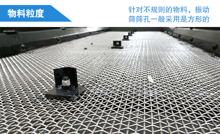 措施:按照物料的粒度規格合理選擇篩網,物料粒度大,選擇的篩孔尺寸就大,針對不規則的物料,振動篩篩孔一般采用是方形的。