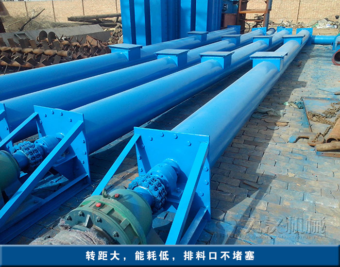 無軸螺旋輸送機又叫螺旋給料機。無軸螺旋輸送機在輸送原理上與一般螺旋輸送機基本相同:即如同一根旋轉的螺旋軸,帶動一個螺母沿其軸向移動一樣,無軸螺旋輸送機螺旋體相當于螺旋軸,物料相當于螺旋輸送機螺母,當螺旋體連續旋轉時則物料也連續輸送。無軸螺旋輸送機螺旋體為較厚的帶狀葉片,通過無軸螺旋輸送機驅動端驅動,中間無軸,螺旋體與機殼內壁底部襯板接觸(滑動)。