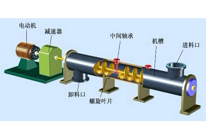 無軸螺旋輸送機主要由驅動裝置、頭部裝配、機殼、無軸螺旋體、槽體襯板、進料口、出料口、機蓋(需要時)、底座等組成。